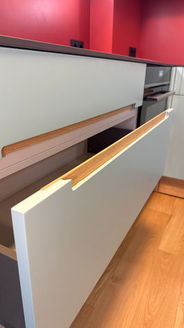 Die eingefrästen Griffe aus Eiche setzen natürliche Akzente und fügen sich harmonisch in das Gesamtbild ein, während sie gleichzeitig die klare Linienführung der Fronten unterstreichen. Besonders praktisch ist die erhöhte Position des Backofens, die ergonomisches Arbeiten auf Brusthöhe ermöglicht und den Alltag in der Küche erleichtert.